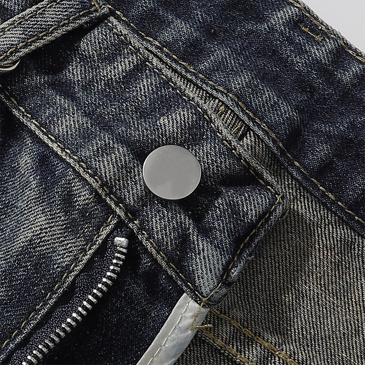 - Dark wash with natural fading, subtle whiskering, and vintage distressed effect