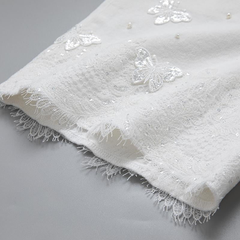 - Sequined heavy-embroidered butterfly denim shorts with pearl accents