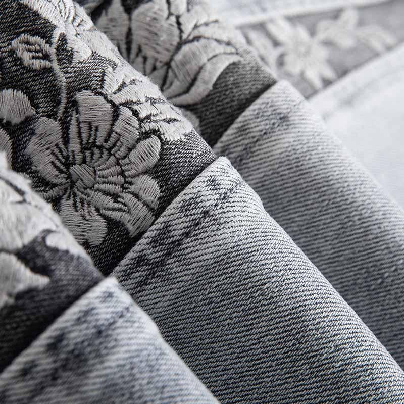- Right leg: patchwork floral-embroidered panel featuring a pearl-encrusted frog closure