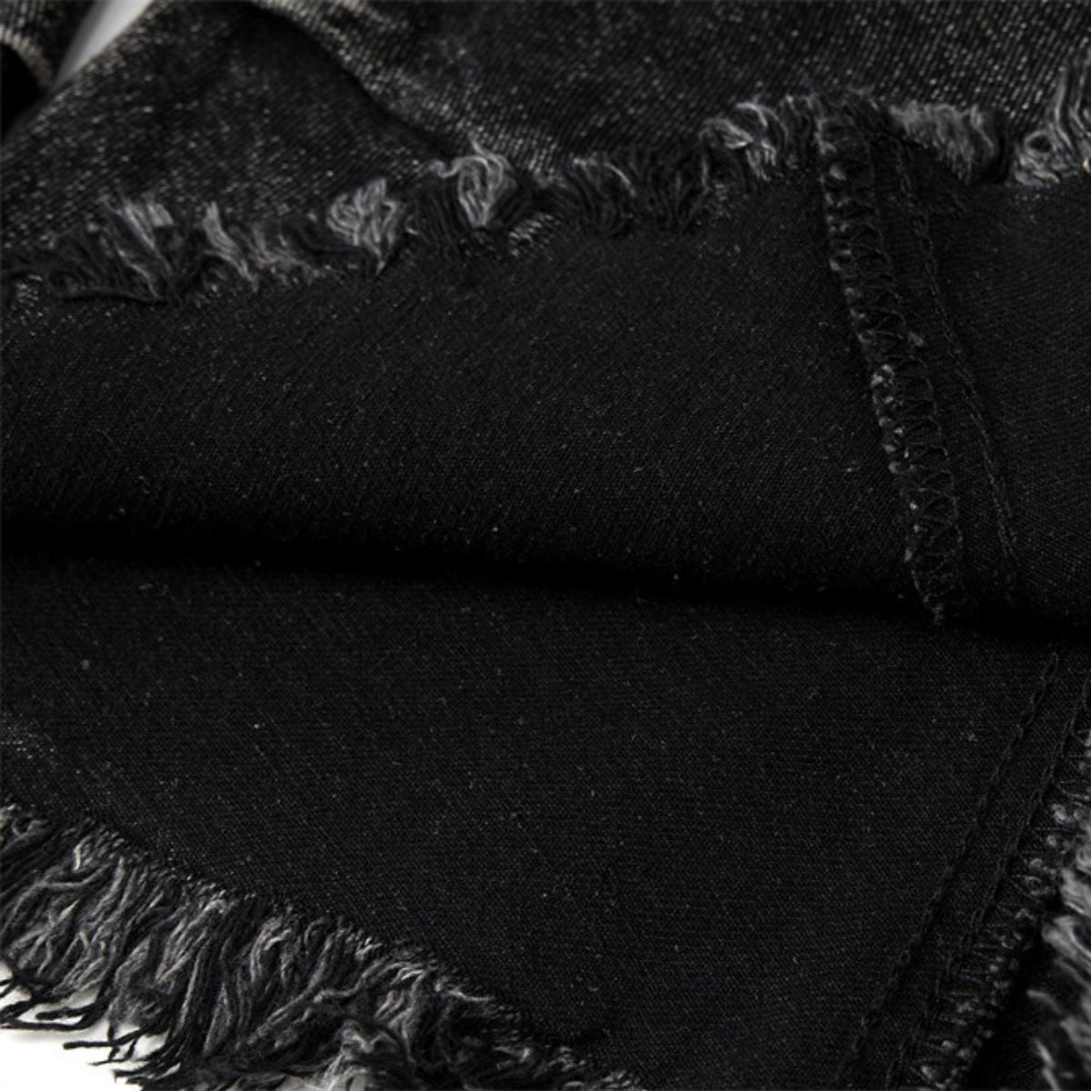 - Unique asymmetrical frayed seam design across the legs