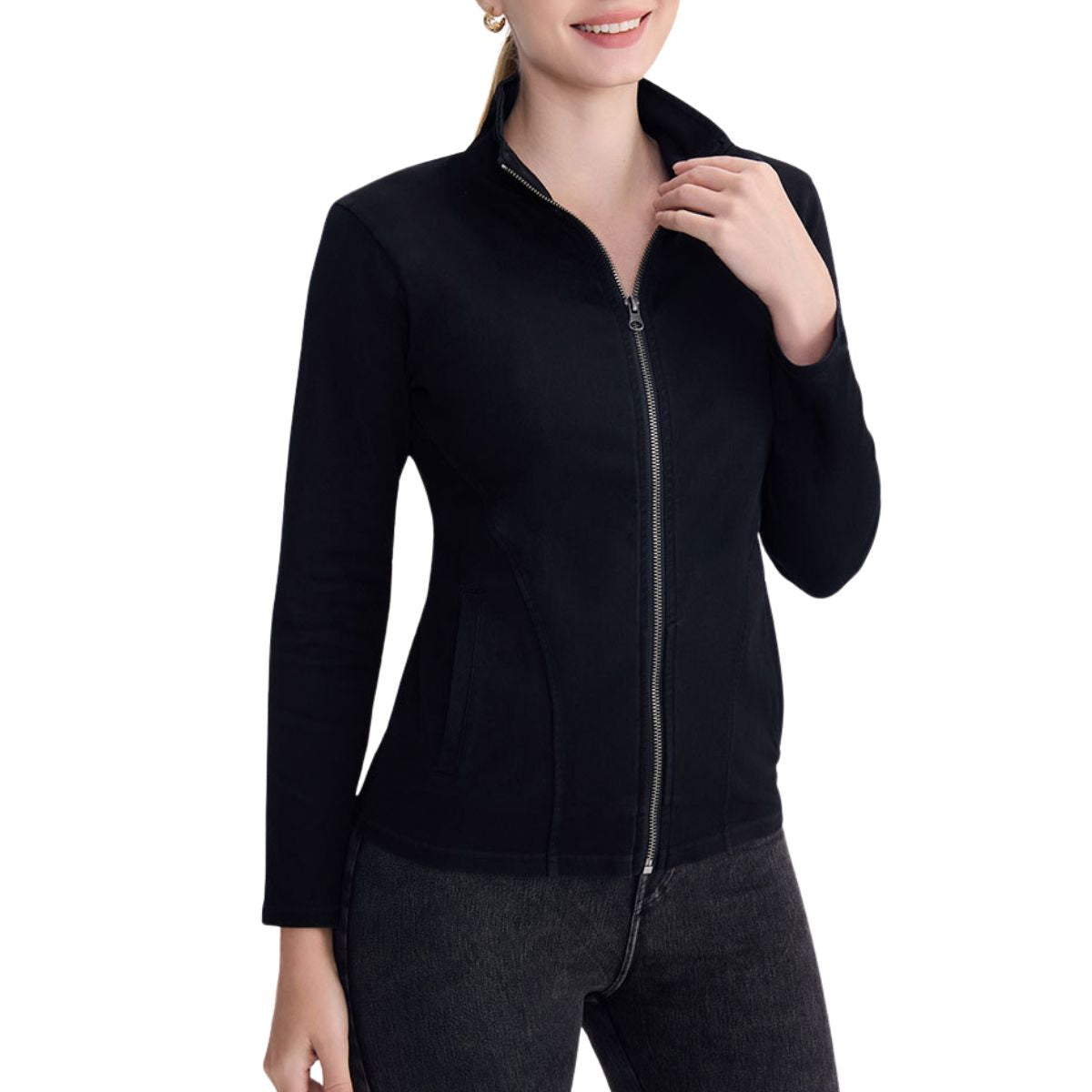lets you move without restriction. - Women's denim zip-up jacket – slim fit long sleeve high collar
