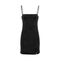 - Women's black denim mini dress with spaghetti straps and frog closures detail
