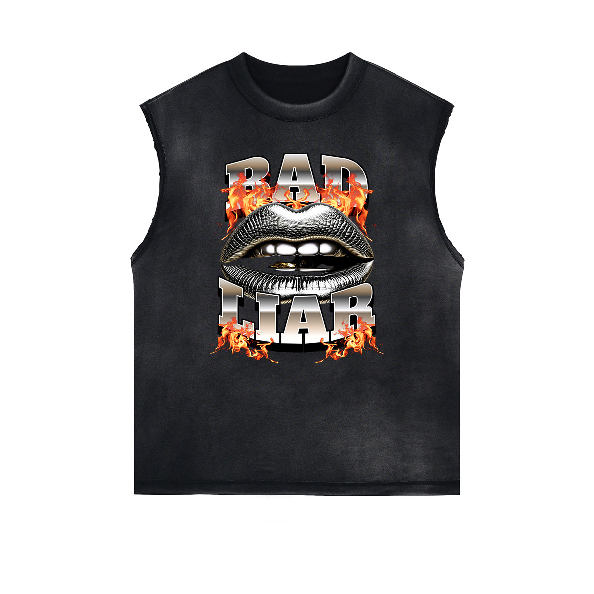 Camiseta sin mangas con gráfico de labios rojos y bordes deshilachados