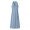 - Sleeveless light blue denim maxi dress with button-down front