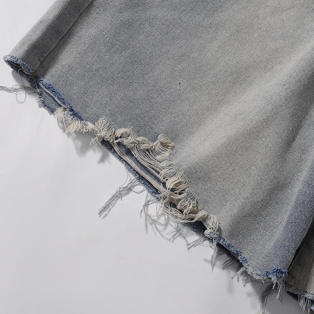 • Bermudas vaqueras con parches de camuflaje mixto y detalles rotos a mano.