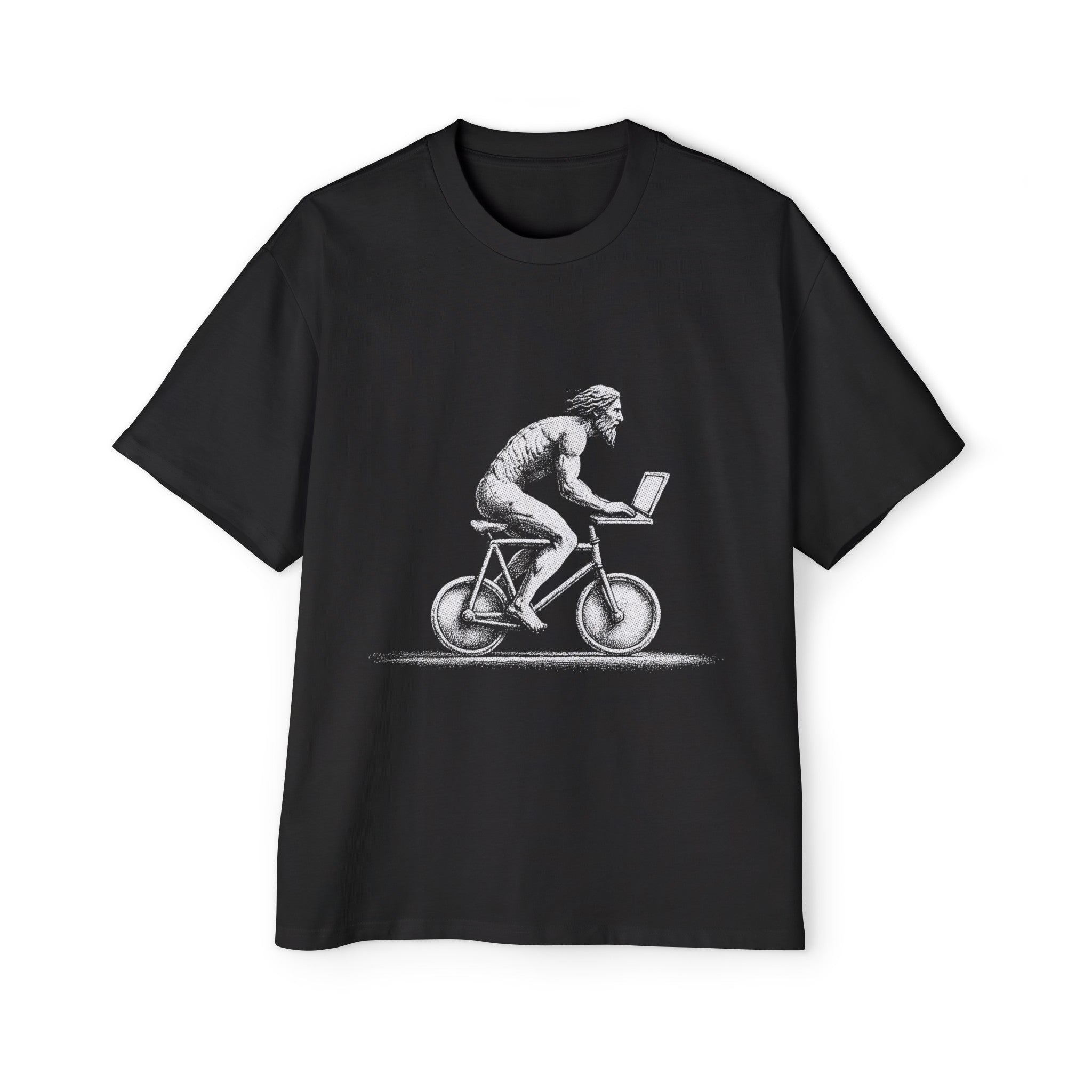 Camiseta gráfica con un humano antiguo montando en bicicleta