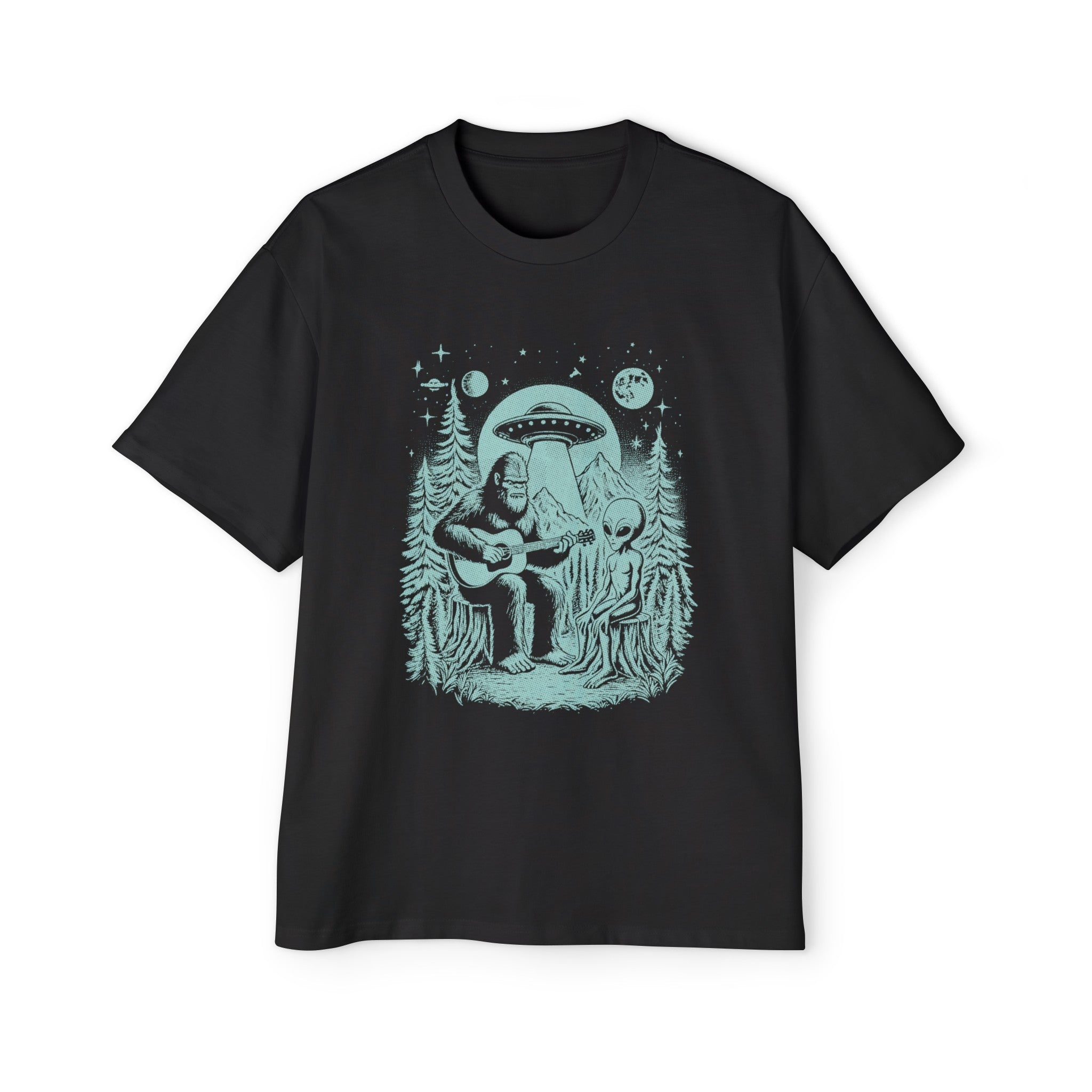 Bigfoot Play Guitar With Alien Graphic Tee-INNBLAC Fashion Apparel