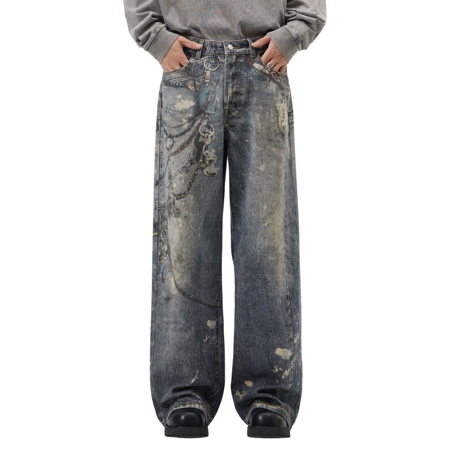 - Baggy jeans in faded denim with allover street print